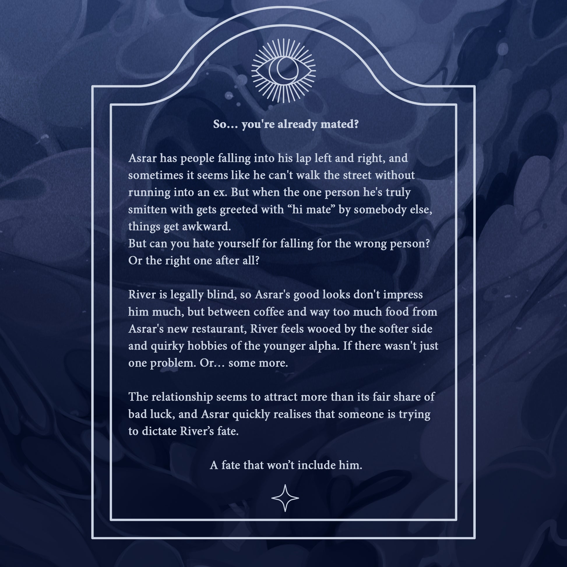 River is legally blind, so Asrar's good looks don't impress him much, but between coffee and way too much food from Asrar's new restaurant, River feels wooed by the softer side and quirky hobbies of the younger alpha. If there wasn't just one problem. Or… some more.